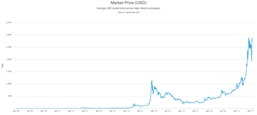 Al 25 luglio 2017, la capitalizzazione di mercato del Bitcoin è di €36.651.396.293 ($42.647.165.334), sono presenti 16.468.975 monete con un prezzo di €2.225,48 ($2.589,54). L’andamento storico del prezzo in USD si può vedere nel grafico seguente: